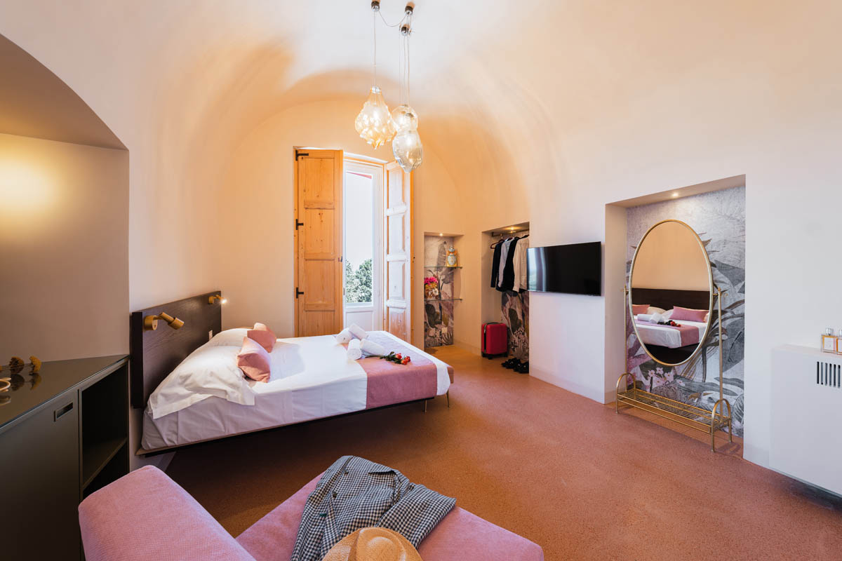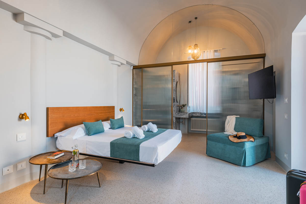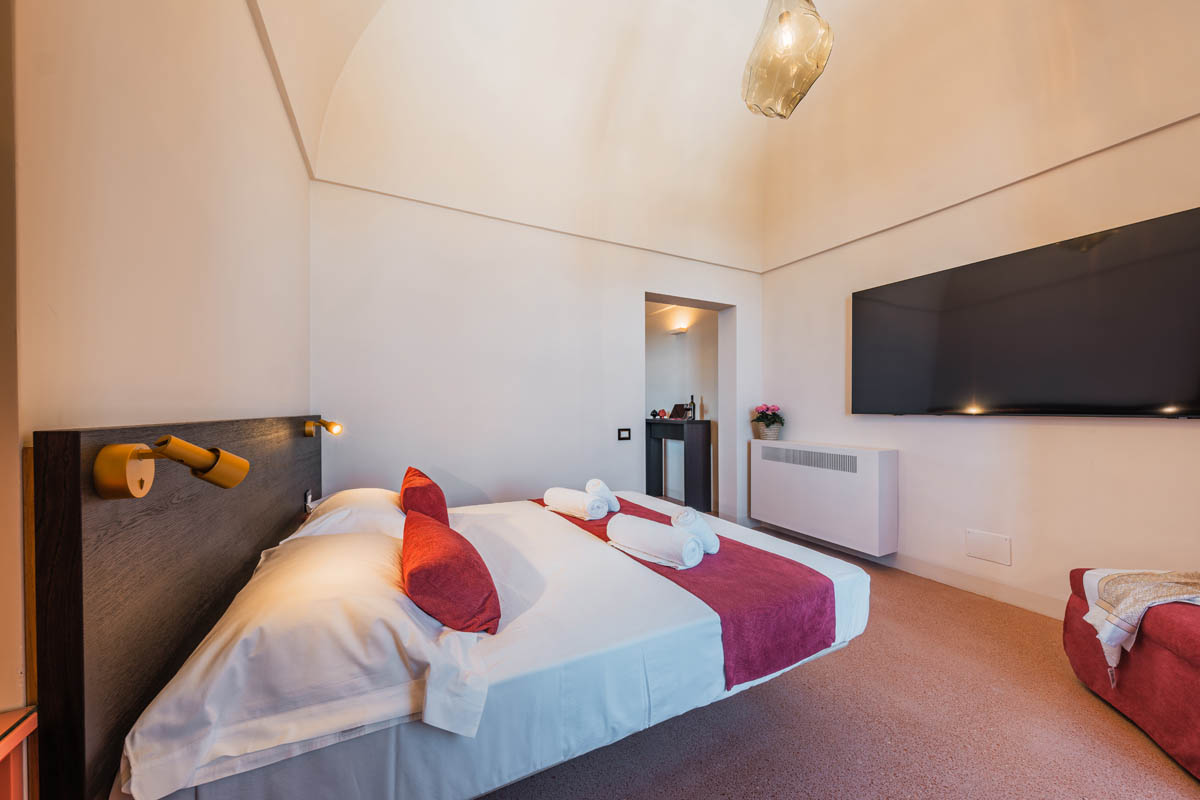 Le Camere Deluxe sono ampie, luminose e raffinate e possono accogliere fino a 3 ospiti, grazie a un letto matrimoniale e a un comodo pouf letto ideale per un adulto o un bambino. Dispongono, inoltre, di minibar attrezzato, aria condizionata, cassaforte, smart TV e connessione Wi-Fi gratuita, un ampio bagno privato, elegante e moderno, dotato di finiture ricercate e comfort di qualità.